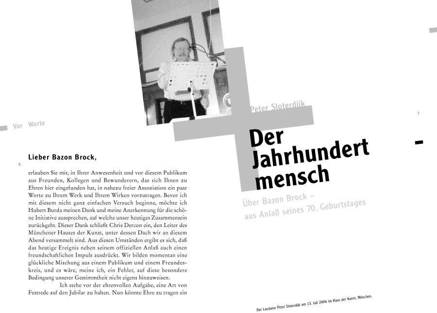 Man kann sich, meine Damen und Herren, einem Künstler, wie einem Denker, nur auf zwei Weisen nähern, die sich diametral gegenüberstehen. Der erste Weg ist der hermeneutische, der Weg der lesenden Geduld, bei dem man den Spuren des Werkes folgt, den Finger auf der Zeile. Man könnte dies die singularisierende Lektüre nennen – und es versteht sich leicht, warum viele Autoren am liebsten auf diese Weise „genommen“ werden möchten. Die andere Methode nenne ich das Konstellationsverfahren beziehungsweise die desingularisierende Lektüre. Hierbei sieht man für eine Weile von der Person und ihrem Werk ab und rückt an ihrer Stelle andere Bezugspersonen ins Rampenlicht, deren Lichtreflexe auf die bewußte Person fallen. Ich habe mich hier für den zweiten Weg entschieden und möchte auf ihm einige Beobachtungen zusammentragen, die helfen sollen, das Profil unseres Jubilars im historischen Kontext besser zu begreifen. Ich habe vier Namen der jüngeren Kunst- und Kulturgeschichte ausgewählt, von denen ich behaupte, sie seien geeignet, das Besondere an dem Phänomen Bazon Brock sichtbarer zu machen – Namen, die längst als Fixsterne am Himmel der Geistesgeschichte fungieren und deren Nennung gleich zeigen wird, auf welche Weise der Duktus des Brock'schen Werks kraft der Konstellationsbetrachtung verständlicher wird.