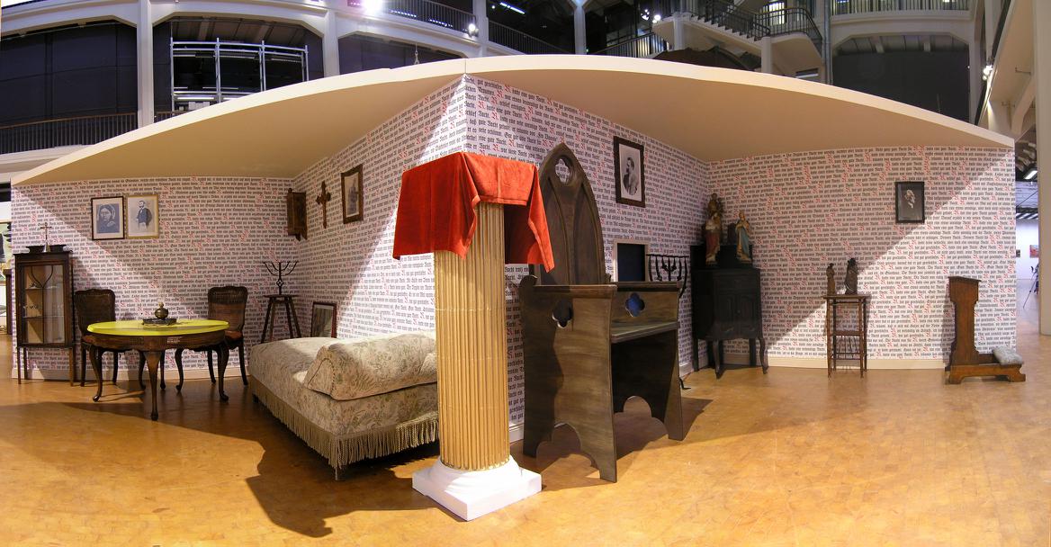 Im Theoriegelände zeigen wir den historischen Experimentalraum für die Selbstentfaltung der deutschen Heimatsucher. Bei dieser Versuchsanlage handelt es sich um die phantasiegetreue Simulation der Wohnung von Ludwig Derleth (1870-1948). Man findet in dieser Inszenierung ausgesuchte Einrichtungsgegenstände, wie zum Beispiel altarartige Aufbauten mit Heiligenfiguren und Kandelabern, eine Betbank, einen Diwan, einen Rundtisch mit gelb polierter Platte, auf der ein Adler eingebrannt ist, und eine Gipssäule mit Altardecke, auf der Brot und Wein präsentiert werden. An den Wänden, unter anderen Photographien, fällt bei einem Photographierten die zur Schau gestellte Pose und Mimik auf, die in unterschiedlichen Ausprägungen an berühmte Darstellungen Dantes, Goethes oder Wagners erinnern. Der Photographierte ist der Großdichter Stefan George, der seinen Bezugsgrößen entsprechend Wirkung zu erzielen versuchte. Sein geistiger Zögling, Ludwig Derleth, gestaltete am Karfreitag 1904 seine Dachkammer zu einem Versammlungsort um, an dem sich bei Kerzenlicht eine Schar von George-Jüngern und anderen persönlich eingeladenen Münchnern einfand. Auch der Schriftsteller Thomas Mann war unter den etwa zwölf extravaganten Geistesdienern, die zu Teilnehmern an einer feierlichen Séance wurden; heute würde man „Performance“ sagen. Mann schildert in seiner Novelle „Beim Propheten“ (1904) erinnerungsgenau, wie sich die effektvolle Einrichtung auf die Besucher auswirkte und was sich in der Bohèmebehausung des „Daniel Zur Höhe“ zutrug; so lautete karikaturhaft der Name Derleths später bei Thomas Mann. (3)