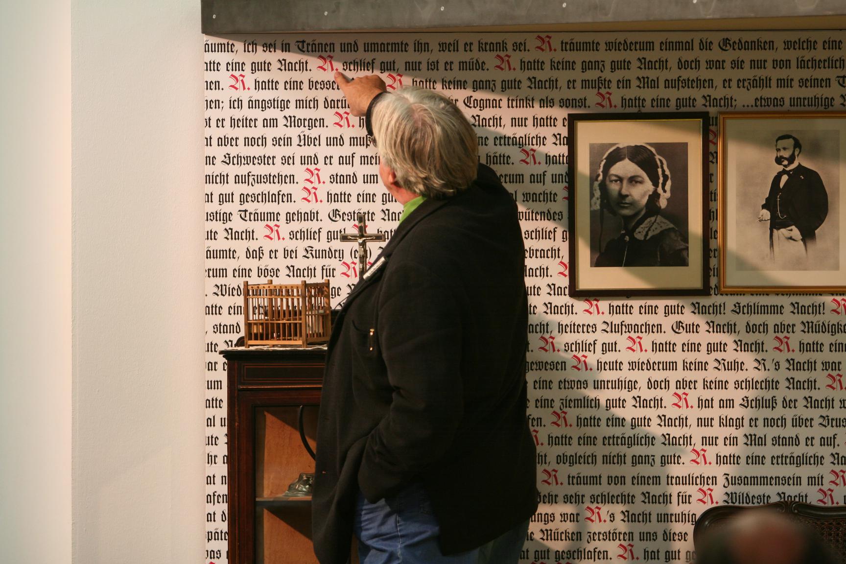 Begleitend zu der Konzeption von Wagners letzter Oper „Parzifal“ und den damit einhergehenden programmatischen Welterlösungsplänen schreibt seit dem 1. Januar 1869 die Komponistengattin Cosima an einem Tagebuch. Täglich berichtet sie über den Fortgang seines Welterlösungsprogramms. Diese von entschlossenem Opferwillen zeugenden Aufzeichnungen Cosimas schmücken anstelle der bei Thomas Mann beschriebenen Tapete mit kleinen Empirekränzen die Wände im Inneren unserer Versuchsanlage. Die ersten Sätze jeder Tagebucheintragung, die wir auf unserer Tapete zitieren, gelten dem Bericht über den Verlauf der jeweils zurückliegenden Nacht: „R. träumte, ich sei in Tränen und umarmte ihn, weil er krank sei.“ oder „R. träumte wiederum einmal die Gedanken, welche eine schlaflose Nacht mir eingab.“ „R. erzählt mir, er habe bis halb zwei auf mich gewartet!“ „R. träumte von einem vollständigen Bruch zwischen uns.“ „R. immer nachts gestört.“ „Von halb vier an schlief R. nicht mehr und hatte Verdauungsbelästigungen.“ „R. hatte eine gute Nacht, das heißt, er stand nur einmal auf.“ Oder „R. träumte einen schlimmen Traum, er sah sich von Juden umgeben, die zu Gewürm wurden und ihm in die Körperöffnungen wie schlimme schleimige Urtiere krochen“. Cosimas wenig rühmliche Rolle wird es sein, die antisemitische Haltung ihres Mannes Richard in den zu Beginn der 20er Jahre entstehenden Kreis um Houston Stewart Chamberlain und Adolf Hitler einzubringen und damit einen Beitrag zu dem von beiden Herren propagierten Erlösungskonzept, der politisch wie religiös motivierten Rassen- und Judenfrage, zu leisten; Cosima war es, die Chamberlain die Lektüre von Arthur Gobineaus Rassenlehre „Essai sur l'Inegalité des Races Humaines / Essay über die Ungleichheit der Menschenrassen“ anempfahl und damit einen grundlegenden Anstoß zur Wissenschaft nachäffenden Diskussion über die Degeneriertheit der Rassen im Anschluß an Wagners „Erlösung dem Erlöser“-Konzept gegeben hat.