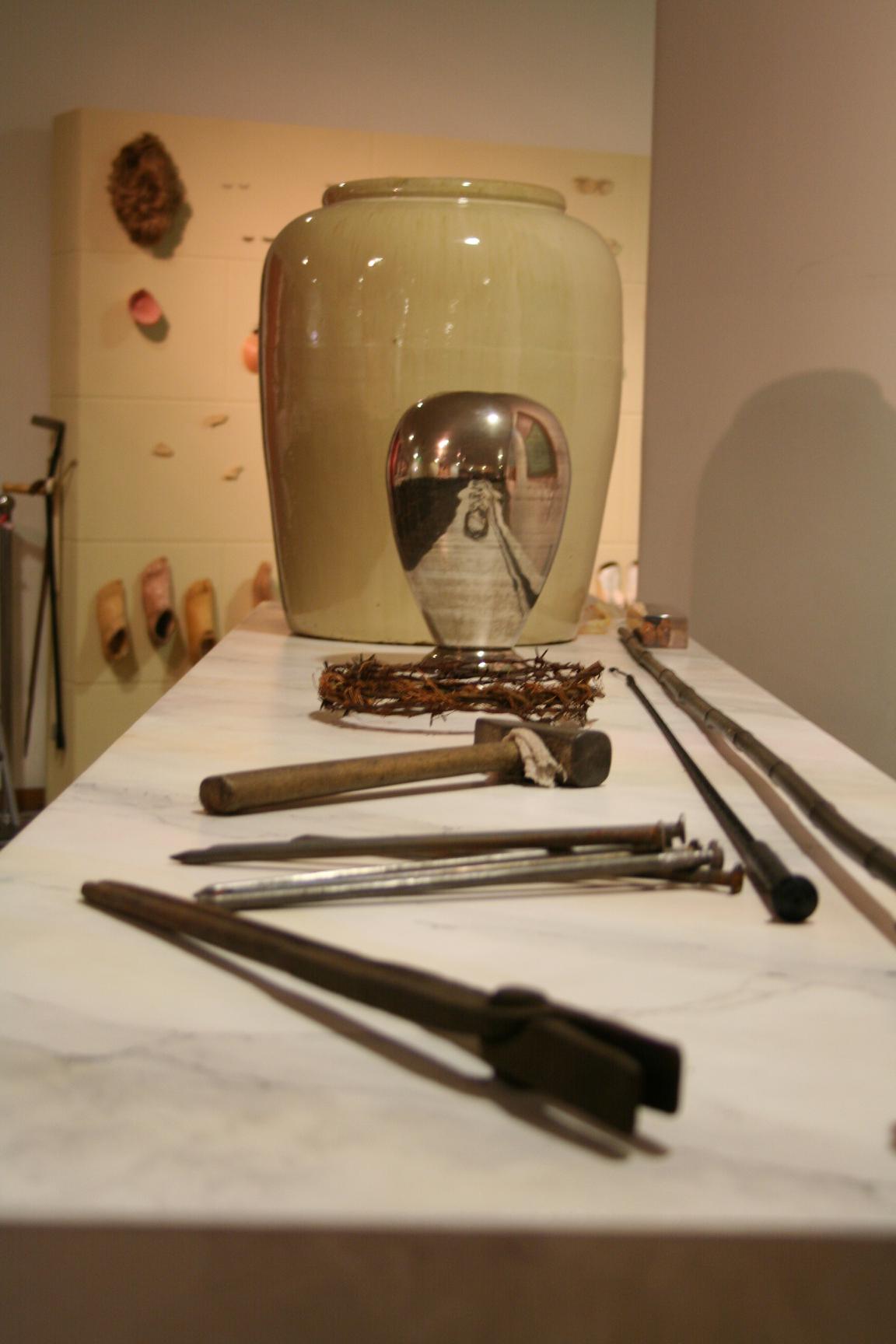 Unter den auf dem Altar platzierten Marterwerkzeugen – Dornenkrone, Zange, Essigkrug, Schwamm, Speer, Hammer, Zimmermannsnägel – fällt die Variante der Geißel auf; dieses Instrument antiken Strafvollzugs zeigen wir in der Gestalt der „Nietzsche-Peitsche“. Mit ihr wird herkömmlich Nietzsches Diktum zitiert: „Gehst du zum Weibe, vergiß die Peitsche nicht“, als hätte Nietzsche sagen wollen, Männer genössen es, Frauen zum Opfer zu machen, um Befriedigung zu empfinden. Aber das Diktum bietet eine entscheidende Erweiterung des Gedankens, eine sadomasochistische Komponente, derzufolge Männer wollten, daß Frauen sie züchtigen, weil sie als Kinder körperliche Bestrafung durch ihnen überlegene Erwachsene als lustvoll erfahren hätten.
