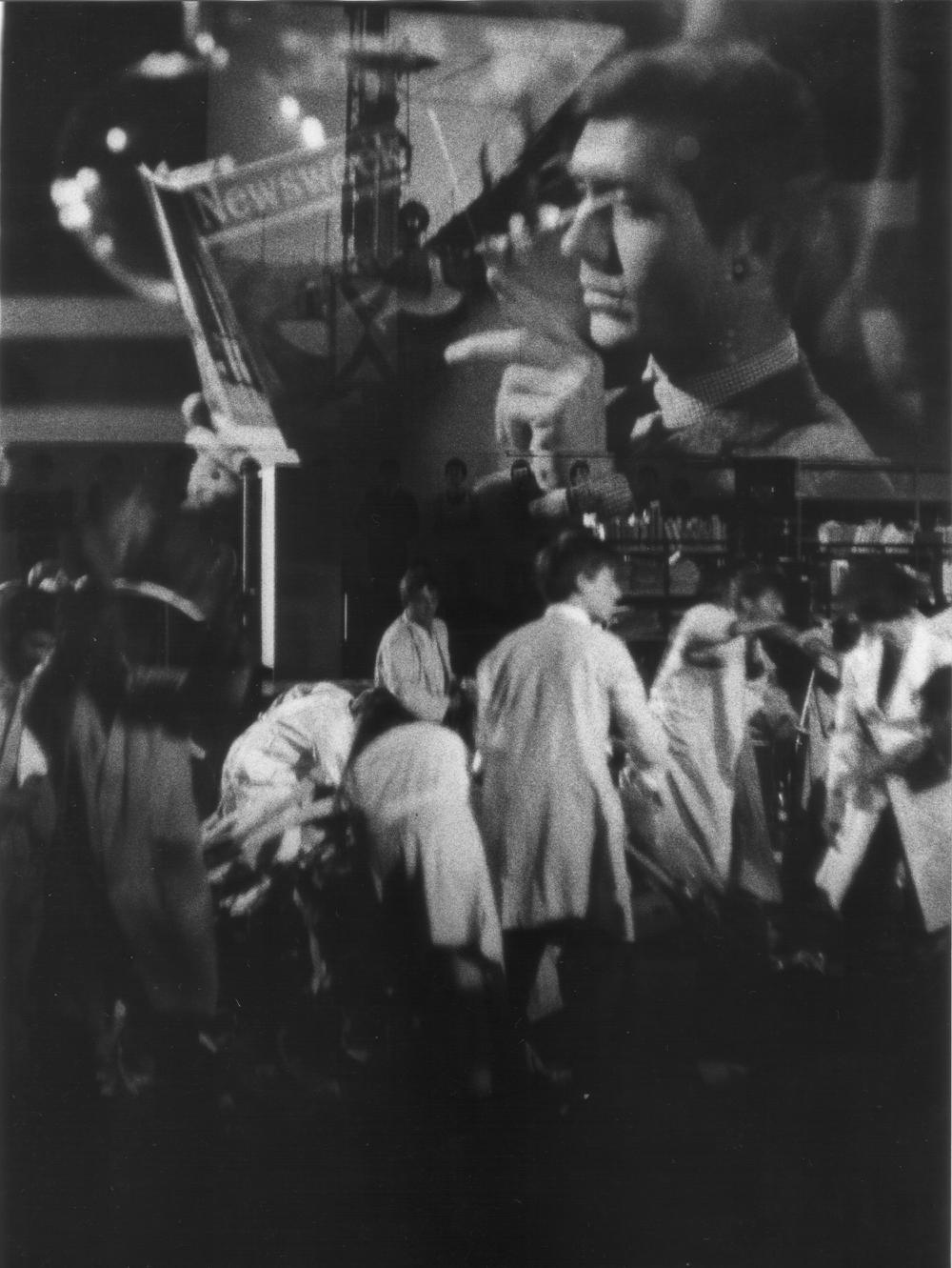 Verwandlung des Lebens in Reste, Unverwertbares, Spuren des Gewesenen. Immer erneuertes Angebot von Waren als Material, das durch seinen Verschleiß gebändigt werden muß. Jetzt beteiligen sich auch Zuschauer an der Umsetzung des Warenangebots. Deutliche Analogien zu anderen schon geschichtlichen Vernichtungsaktionen. Die Protagonistin läßt sich vom Professor überreden mitzumachen, um sich von dem Emotionsstau ihres gegenwärtigen stagnierten Lebens zu entlasten. Das gelingt ihr offensichtlich nicht. Deshalb versucht sie, sich vor dem übermächtigen Kaufhauswarenangebot auf Erinnerungswerte zurückzuziehen, die an alten Fotos, Kleidungsstücken, Landschaften, Fahrkarten usw. hängen. Diese Gegenstände sind im Spielfeld aufgebaut. Die Protagonistin spielt eine Geschichte, aus deren Zusammenhang möglicherweise die einzelnen verbrauchten Gegenstände (Erinnerungen) stammen. Sie will die vereinzelten Gegenstände mit ihrem Leben identifizieren, um dessen sinnfälligen Verlauf und Zusammenhang zu demonstrieren. Sie spielt und stellt einzelne Stationen dieses Lebens nach, kann ihnen aber in den Augen des Publikums keinerlei Evidenz abgewinnen. Sie wird ständig von den Umstehenden zur Korrektur gezwungen bzw. ausgelacht. Sie selbst wird den Zuschauern zum Objekt wie eine Ware, die man zerlegt an der gegenüberliegenden Wand in einzelnen 'Schaufenstern' nacheinander ausstellt: eine vereinzelte Hand, eine Kniekehle usw. Ihr Leben wird wie eine Ware beliebig vervielfältigbar: die Zuschauer kaufen Teile ihres Lebens und spielen mit ihr nach ihren Wünschen und Vorstellungen die einzelnen erinnerten Begebenheiten durch. Die angenehmsten Lebensabschnitte (nächtliche Autofahrt zu zweit, mit vollem Scheinwerferlicht durch das dunkle Spielfeld, wobei die Lichtkegel immer wieder im Spielfeld einzelne Begebenheiten erfassen, die sich nächtens an und auf Straßen abspielen) werden von mehreren Zuschauern gekauft und deshalb mehrmals mit immer anderen Zuschauern wiederholt. Die Lebensverbraucher bauen nach dem Muster der Lebensabschnitte der Protagonistin nun mit Frauen, Freunden oder Zufallsbekanntschaften ihr schon gelebtes Leben noch einmal, jedoch mit anderen Resultaten nach.