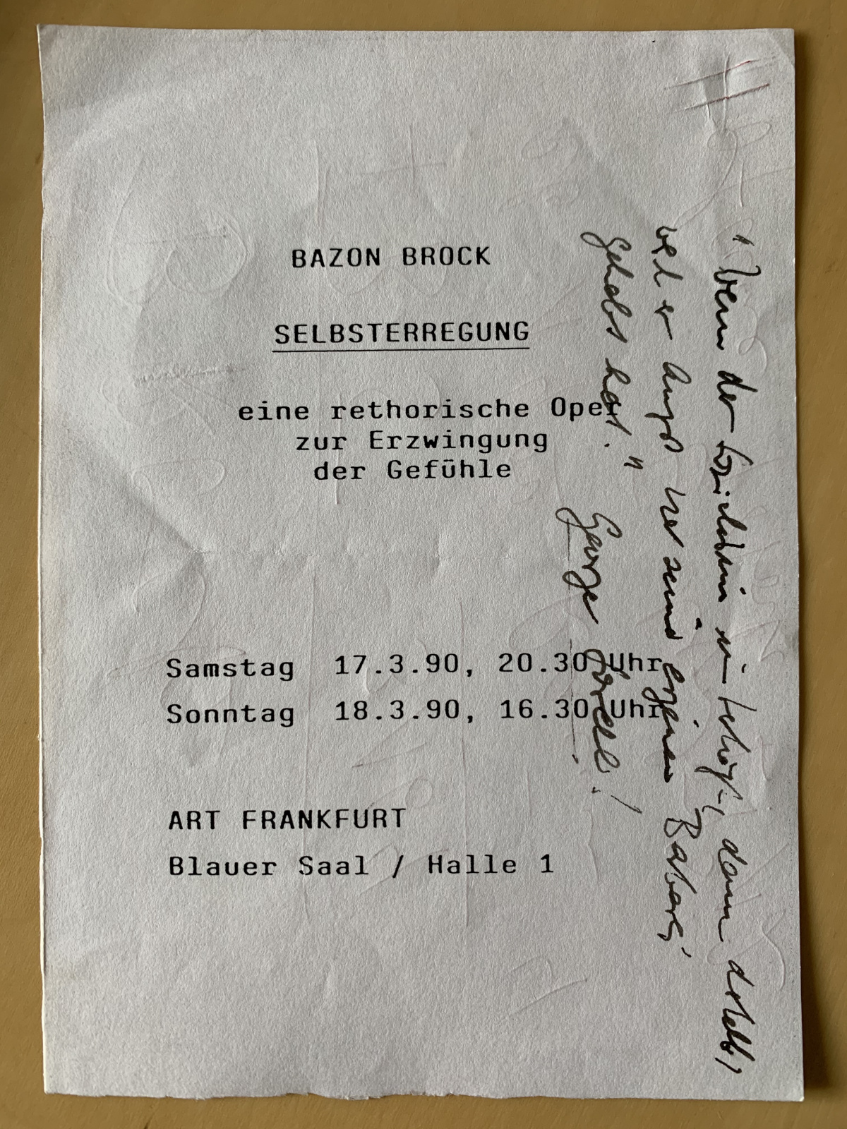 Brüderlins Adresse zu der Zeit, als er Ende der 1970er Jahre in Wien bei Bazon Brock studierte. 15 Jahre später promovierte er bei Brock in Wuppertal mit einer der wichtigsten ästhetisch-kunstgeschichtlichen Arbeiten des 20. Jahrunderts: „Die Einheit in der Differenz: die Bedeutung des Ornaments für die abstrakte Kunst des 20. Jahrhunderts“, Diss. Wuppertal 1995.