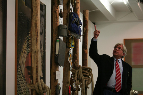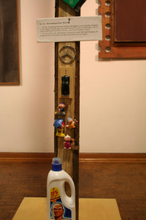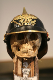 Die Spitze des zweiten Thementotems bildet die wilhelminische Pickelhaube, eine Art militärischer Version der Tarnkappe des Nibelungen, die einem Totenschädel aufgesetzt wurde. Es ist eine verhüllende Enthüllung besonderer Klasse, daß deutsche Krieger von den Zeiten der Freiheitskriege bis ins Dritte Reich ausgerechnet das Emblem des Totenschädels trugen. Soldaten führen immer nur ein Leben zum Tode, o Heidegger! Das ist der Grund, weshalb sie immer schon den Denkern voraus waren und selbst deutsche Philosophen den Ernstfall des Krieges nicht in ihr Nachdenken über die Welt aufnahmen. Der mit Pickelhaube bewehrte Soldat ist der Inbegriff der kulturellen Todes- und Tötungsbereitschaft. Das Lützow’sche Freikorps (1813) führte das Totenschädelemblem zum Zeichen unbedingten Opferwillens im Namen des deutschen Widerstands gegen und Befreiungskampfes von Napoleon ein. Später bediente sich die SS ebenfalls dieser Emblematik, ein weiteres Indiz, um die Deutschen in den Augen der anderen Nationen als mörderische Krieger und todessüchtige Kanonenhelden erscheinen zu lassen.