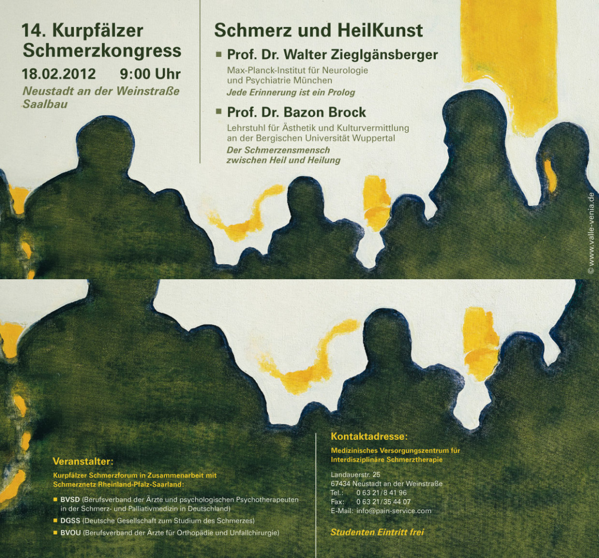 Neustadt/Weinstr. (ots) - Prof. Dr. Bazon Brock, Gründer der Denkerei Berlin und Prof. Dr. Walter Zieglgänsberger Hirnforscher und Schmerzpreisträger, Max-Planck-Institut für Psychiatrie München treffen sich auf dem 14. Kurpfälzer Schmerzkongress in Neustadt a.d.Weinstr. Zusätzlich die musikalische Begegnung der besonderen Art im Rahmen des Kongresses: Valle venia art and Science mit Kompositionen von Leo Philipp Schmidt - Birgit Böhme, Cello, Gründerin des Faustquartetts - Hakim Ludin, Perkussion.