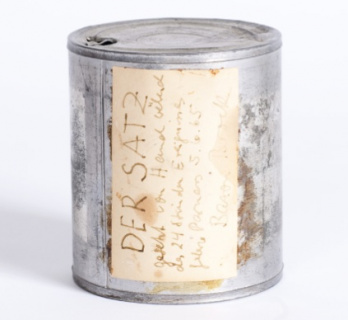 Dose „Der Satz“, theoretisches Objekt, 1965, Bild: Aufschrift: DER SATZ gesetzt von Hand während des 24 Stunden Ereignisses, Galerie Parnass 5.6.65, Bazon Brock.