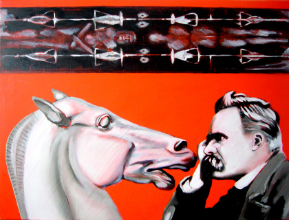Nietzsche war in Lou Salome verliebt und wollte sie küssen, aber sie wollte den Arzt Paul Ree küssen. Als Ergebnis – Ressentiment und Nietzsche küsst das Pferd, weil die aktive Mitfreude (im Gegensatz zum passiven Mitleid) ein höherer und wichtigerer Wert ist. amor fati. Die Frage: Ist das Pferd krank? Vielleicht Maul- und Klauenseuche?