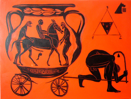 Aristoteles, der von Gerpillis geritten wird, und das Schwein – das soziale Tier. Platon, die freie Pythia, die die Stadt kompensiert und das gerupfte Huhn mit den dreieckigen Eiern. Der vor Publikum onanierende Diogenes und der Pawlowsche Hund. Nietzsche, Lou Salome und das Pferd.