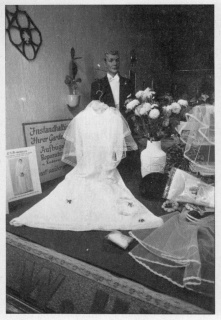 Auch die ausgestellten Hochzeitskleider, Bilder (I) und (J), sind von ihrem Verwendungszweck her hochgradig bestimmt. Das Brautkleid kann nur zur Hochzeit getragen werden. Die Einmaligkeit seines Verwendungszweckes macht es notwendig, den Gegenstand selber zu etwas Kostbarem zu stilisieren, in der Auswahl des Materials, der Farbe und des Schnitts. Der Schnitt des Gewandes, seine Materialfülle steht bis auf den heutigen Tag in der Tradition der Ritualgewande. Die Materialität des Hochzeitskleides zwingt seiner Trägerin Verhaltensweisen auf, die dem Ritual angemessen sind: Würde in der Langsamkeit des Schreitens, eine gewisse Bewegungsstarre, die entpersönlicht und damit die bloße Beliebigkeit jeweils persönlicher Ausfüllung des Rituals verhindert. Nicht nur die Furcht, das Kleid zu beschmutzen oder zu beschädigen, veranlaßt die Trägerin, ihre mögliche spontane Reaktion zu unterdrücken. Entscheidend ist, daß durch das Tragen des Ritualkleides die Trägerin die dem Ritual angemessene Verhaltensweise wenigstens formal erfüllen kann, wo diese Verhaltensweisen nicht mehr erlernt und inhaltlich nicht erfaßt werden. Solche Ritualkleidung ist außerhalb der rituellen Handlung nicht tragbar, da sie den dafür notwendigen Verhaltensweisen und Entäußerungsweisen im Wege steht. Es sei denn, der gesamte Lebensbereich wäre hochgradig ritualisiert wie in der alltäglichen Verhaltensritualisierung bei Richtern, beim Klerus. Dem entspricht, daß etwa Herrschaftsrollen durch die Jahrhunderte hin mit der Ritualisierung des Verhaltens einhergingen, wodurch die Repräsentation der Herrschaft von den Momenten bloßer personaler Herrschaftsansprüche befreit wurde. Das Ritualgewand wird zur Arbeitskleidung der Herrschaft Ausübenden. Ritualgewande sind wenigstens knöchellang, zumeist schleppenförmig ausgeweitet, schwer und verweigern die Anpassung an die individuellen Körperformen. Das hier abgebildete Schaufenster (I) zeigt demzufolge ganz richtig, daß selbst der zu einer Hochzeit notwendige männliche Partner nur eine formale Position des Rituals erfüllt. Selbst er wird zur Staffage wie Schleppenträger, Trauzeugen, Blumenkinder, Brautjungfern. Die Schaufensterbetrachterin als potentielle Braut braucht sich selbst nur in die durch das Ritual eindeutig vorgegebenen Handlungsabläufe einzugliedern, indem sie sich selbst zur Trägerin des Hochzeitskleides macht.