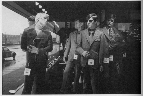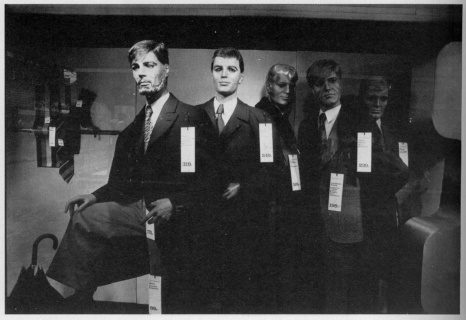 An den Bildern (K) und (L) läßt sich der Unterschied einer Formalisierung, wie sie durch die standardisierten Bewegungsabläufe von Mannequins erzwungen wird, und dem persönlichen Ausdrucksgestus eines Kleiderträgers ablesen. In Bild (K) dominieren gerade wegen der hochgradigen Formalisierung des Bewegungsausdrucks die Gegenstände und Kleider, auf die das Käuferinteresse gelenkt werden soll. In Abbildung (L) ist der Ausdrucksgestus im wesentlichen reduziert auf geschlossene Körperhaltung und Mimik. Die Aufmerksamkeit des Betrachters richtet sich wesentlich auf die Erfassung des mimetischen Ausdrucks und nicht auf die Wahrnehmung der angebotenen Kleidungsstücke. Demzufolge könnte man sagen, daß die Figuren der Abbildung (L) im Hinblick auf das, was sie ausdrücken, befragt werden können, da ja gerade ihr Verhalten keine Formalschematisierung bestimmt. Gerade dort, wo sich Schaufensterdekorateure und ihre Auftraggeber einer Art realistischer Präsentation von Kleiderträgern befleißigen, läßt sich aus den präsentierten Figuren eine Aussage über die abgebildeten Menschen machen, insofern als sie Stellvertreter der vor dem Schaufenster stehenden potentiellen Käufer sind. Bei einer Formalschematisierung wie im Ausdrucksgestus des Mannequins wird kaum eine Käuferin zur Aufnahme solchen Gestus überredet. In den Schaufensterfiguren, die lebenden Personen nachgebildet sind und deren Bewegungsgestus Persönlichkeitsausdruck bleibt, wird sich ein potentieller Käufer selber sehen können. Er wird die Kleidung als Form des Persönlichkeitsausdrucks verstehen und versuchen, durch den Erwerb der Kleidungsstücke zu einem ähnlichen Persönlichkeitsausdruck zu kommen.