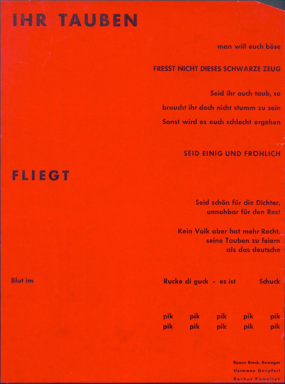 Ihr Tauben, Bild: Plakat zur Aktion im Rahmen der "Donnerstagsmanifeste" von Bazon Brock und Hermann Goepfert, Kunstkabinett am Steintor, Hannover 20.9.1963 & Musee d'Art Moderne, Paris (Biennale der Avantgarde), Oktober 1963/Frankfurt am Main 1962/63..