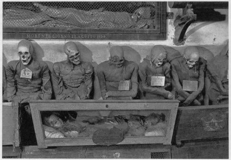 Die erwartete Zukunft wird offensichtlich als eine Ewigkeit des Gegenwärtigen verstanden. Denn selbst die Gesellschaft der Toten kennt noch scharfe Trennung der Berufe und Stände. Immerhin wird hier die Anstrengung, das Leben des Einzelnen auf Dauer zu stellen, nicht mehr nur dem Herrscher zuteil, sondern jedem Fleisch von seinem Fleisch., Bild: Palermo 1972 © Melusine Huss.
