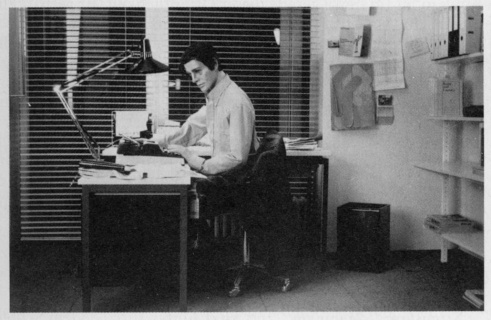 Modern ausgestatteter Büroraum, Tisch, Telefon, große Fenster, Regale, Ablagen usw. An der Wand Urlaubspostkarten, Kalender, Pressefotos usw.