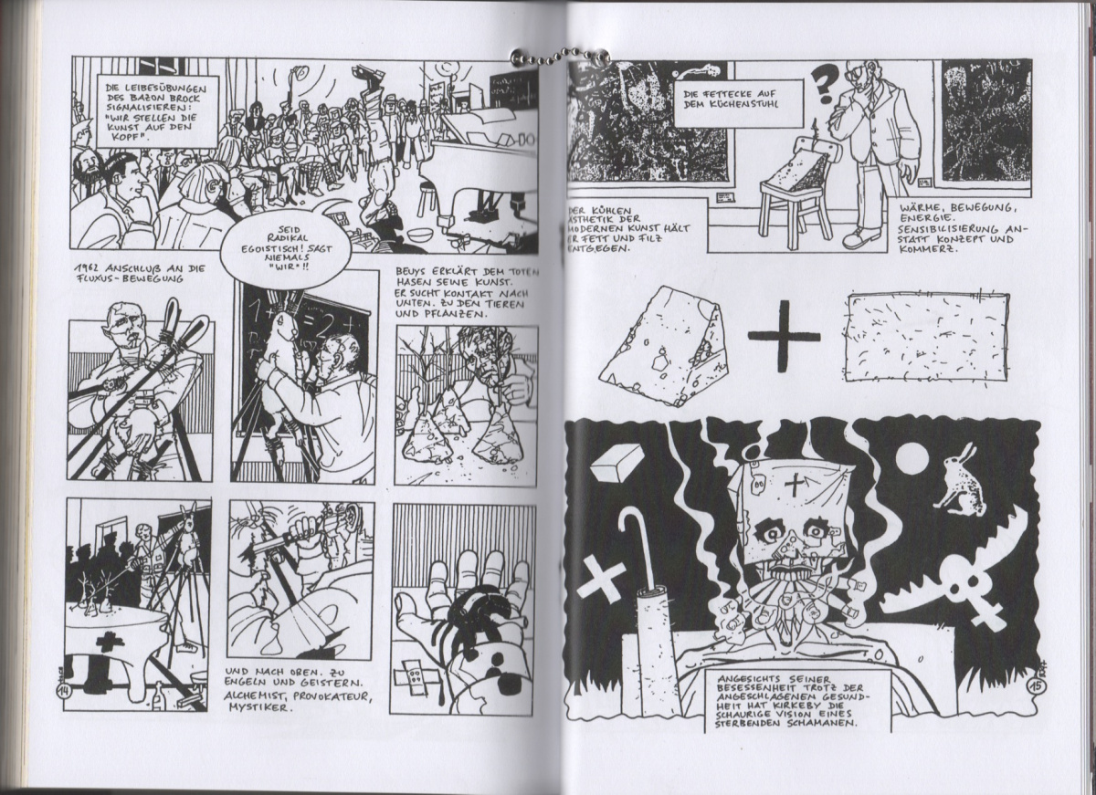 Aus: Joseph Beuys. Der lachende Schamane. Comic-Biographie von Bernd Jünger und Willi Blöß, Bild: In: Ein hoher Berg ist unser Gott. Michael Berger u.a., Wiesbaden 2020/21, o.S..