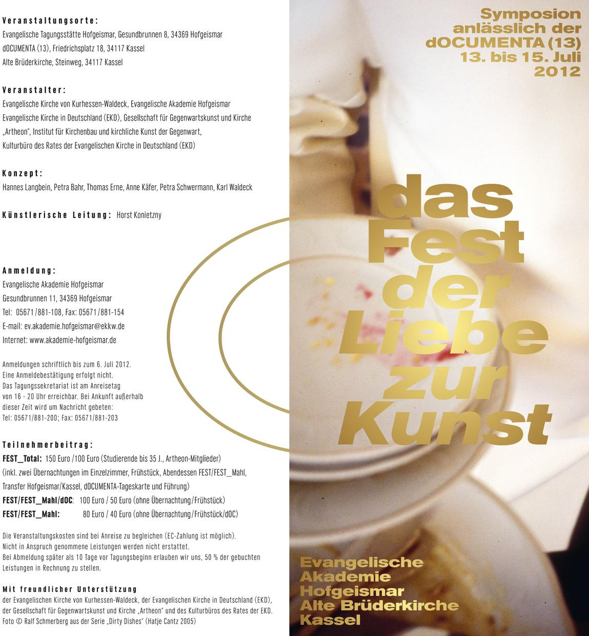 2012 ist das Jahr der dreizehnten dOCUMENTA in Kassel - und das zwanzigste Jahr der Gesellschaft für Gegenwartskunst und Kirche „Artheon". Beides sind Gründe zu feiern. Deshalb lädt „Artheon" gemeinsam mit der Evangelischen Kirche von Kurhessen-Waldeck, der Evangelischen Akademie Hofgeismar, der Evangelischen Kirche in Deutschland (EKD), dem Institut für Kirchenbau und kirchliche Kunst der Gegenwart und dem Kulturbüro der EKD vom 13. bis 15. Juli 2012 zu einem gemeinsamen Symposion: Dem „FEST (der LIEBE zur KUNST)" - mit einem festlichen Auftakt in der Evangelischen Akademie Hofgeismar, einem dOCUMENTA-Besuch und einem theologisch-philosophischen Bankett in der Alten Brüderkirche in Kassel - unter den Gästen: Petra Bahr, Brigitte Boothe, Bazon Brock, Thomas Erne, Jochen Hörisch, Klaas Huizing, Wolfgang Ullrich, Jan Wagner und viele andere. Feiern Sie mit!