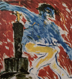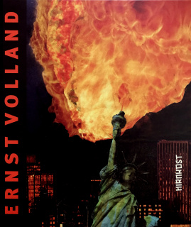 In diese Tradition gehören u.a. solche Figuren, wie sie Gunter Rambow selber darstellt oder Klaus Staeck oder der hier präsentierte Ernst Volland, der in dieser Kraft der Selbständigkeit und Unbeeindruckbarkeit durch äußere Versuche der Einwirkung, wie beispielsweise Zensur, lebt und wirkt. Der hier ausgelegte Band über sein Werk, den ich Ihnen ganz dringend empfehle, zeigt von der ersten bis zur letzten Seite das Prinzip seiner Arbeit. (1) [Abb. 1] Sie sehen hier auf dem Einbanddeckel an der Freiheitsstatue die wirkliche Bedeutung der Flamme der Freiheit, die alles verzehrende Macht des Feuers der Kriegsmaschinerie beispielsweise oder der Schwerindustrie, die Ihnen erkennbar macht, was das Prinzip der Arbeit dieser Einzelgänger ist.