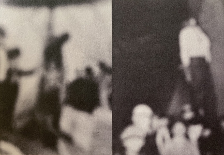 Der Effekt, den Sie hier sehen, ist, daß wir auf kabarettistische Vernunft, auf eine bestimmte Art der Selbstreflexion als Selbstbefragung oder Selbstthematisierung der Schauenden angewiesen sind, nämlich auf den Zusammenhang der kognitiven Verfahren der Vernunft und des Verstandes mit Verweis auf das, was wir tatsächlich wahrnehmen. Was wir wahrnehmen, nennen wir evident. Evidere heißt: Wir sehen nach eigenem Augenschein: Das Bild dort hinten in der Mitte scheint so auszusehen wie das Porträt von Anne Frank. Das Bild rechts daneben sieht so aus wie die Hängeaktion beim Einmarsch in Polen, und die Gesellschaft unten wie die berühmten Lynchjustizszenen aus dem Süden der Vereinigten Staaten. Wenn Sie sich diese Bilder ansehen, kommt es zum Konflikt zwischen dem, was Sie begrifflich fassen können, nämlich Selbstjustiz des Mobs im Süden der USA, und dem, was Sie namentlich fixieren; während andererseits der Augenschein, die visuelle Bestätigung für dieses Begriffsbild, nur unscharf gegeben, nur eine Annäherung sein kann. Die Frage ist: Ist das eigentlich der Erfolg der Begriffsbildung, daß die Wahrnehmung so weit zurückgedrängt wird, daß sie nur noch auf eine Art von Anschein reduziert wird, oder ist es umgekehrt, brauchen wir den Anschein, um endlich dazu angehalten zu werden, Begriffe zu bilden? In diesem Fall ist es klar: Uns werden zuerst tausendfach in allen Zeitungen Anne Frank und die Erhängungsszenen von Polen bis hin zu den Südstaaten vorgeführt. Das prägt sich uns ein, brennt sich uns ein, wie Volland sagt. Das sind in unser kollektives Gedächtnis eingebrannte Bilder, die dann in eine Ebene zurückversetzt werden, die das Denken und Begriffsbilden dazu herausfordert, sich klar zu machen, was man da eigentlich sieht, wenn man so eine Szene vor sich hat.