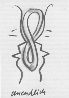 Übrigens hat Blume schon vor zwölf Jahren für das heute populärste Phänomen der Bipolarität von Negativ und Positiv, nämlich für das schwarze Loch, Erscheinungsweisen demonstriert, die etwa den Beuysschen weit an Radikalität und Subtilität überlegen sind. Die Belege wurden leider als bloße Polaroidfotos unter nicht mehr ausmachbare Zufallsbekanntschaften von Blume verstreut, so daß sie mit wenigen Ausnahmen nicht mehr auffindbar sind. Den Höhepunkt aller bisherigen Versuche hat man in jenen Exempeln zu sehen, die Blume für das Problem der Selbstbezüglichkeit gibt. In der Kunst wurden etwa von Steinberg oder Escher oder Magritte (den bisherigen Großmeistern der Reflexivität) solche Selbstreferenzen als Zeichnungen einer sich selbst zeichnenden Hand thematisiert. Dem entspricht bei Blume etwa die häufige Darstellung einer Zunge, die eben sich selbst anstelle einer Oblate ›auf der Zunge hat‹, also schmeckt und formt. Sich selbst formende Formen treten bei ihm häufig in Analogie zu den Vorstellungsbildern vom sich selbst verdauenden Magen auf. Mit all diesen Vorübungen bereitet sich Blume wie ein Tiefseetaucher auf das große Abenteuer der Identifikation von Vermutungen über fremde Welten vor, auf das Kunststück, die sich selbst denkenden Gedanken ideoplastisch zu vergegenständlichen.
