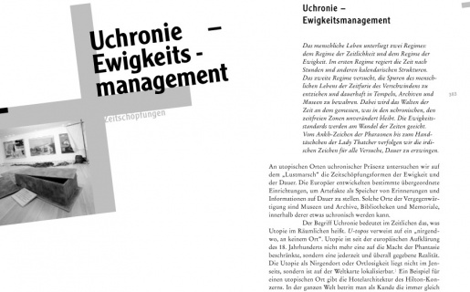 An utopischen Orten uchronischer Präsenz untersuchen wir auf dem „Lustmarsch“ die Zeitschöpfungsformen der Ewigkeit und der Dauer. Die Europäer entwickelten bestimmte übergeordnete Einrichtungen, um Artefakte als Speicher von Erinnerungen und Informationen auf Dauer zu stellen. Solche Orte der Vergegenwärtigung sind Museen und Archive, Bibliotheken und Memoriale, innerhalb derer etwas uchronisch werden kann.