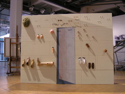 Im Theoriegelände zeigen wir die auf die Leistungen des großen preußischen Baumeisters Karl Friedrich Schinkel zurückverweisende Fake-Wand, der verschiedene Objekte appliziert sind, die den Betrachter mehr oder weniger peinlich an heutige Anpreisungen von Schönheitschirurgie am weiblichen wie männlichen Körper und an plastische Chirurgie zur Wiederherstellung von Körpern nach Deformationen durch Krankheiten und Unfälle denken lassen.