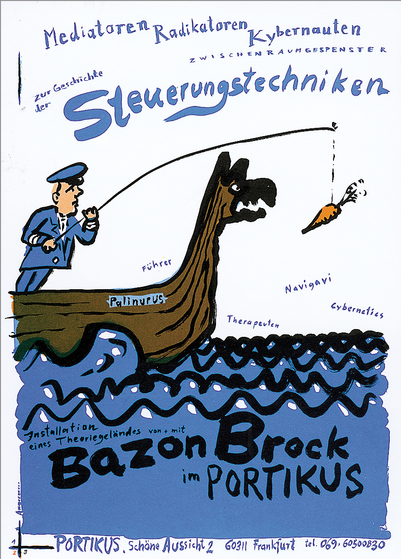 „Installation eines Theoriegeländes“, Bild: Plakat zur Aktionsausstellung „Mediatoren Radikatioren Kybernauten“, Portikus, Frankfurt a. M. 1997. Gestaltung: Peter Angermann..