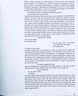 Das Schweigen ist die perfekte Anwesenheit der Sprache, ein Ton, der sich summiert, ein Wort, das auf sich selbst reagiert und sich eindrückt in das Metier, das es eben noch als Wort erkennbar sein ließ. Parallelaktionen der Worte führen zur Monotonie im Geräusch der sich abwickelnden Sprache, eine Wortfolge in horizontaler Ausdehnung steigt auf und rapportiert die Emotionszentren unserer Muskulatur des Mundes, des Ohres, des Auges. So nähern wir uns der Sprache des Schweigens. Ein rollender Güterwagen, die ununterbrochene Detonation der Granaten, das mit seinem Stillstand beschäftigte Meer behaupten sich im Klima unserer Haut, im Marsch der Vokale und Konsonanten zum wesentlichsten Teil unserer Operationen, der Vermittlung unserer individuellen Struktur an die Gesamtheit der Möglichkeiten zu leben. Die Sprache des Schweigens (oder die Sprache des unendlichen Geräuschs) ist umfassender und dichter als die Sprache der nur in bestimmter Richtung geübten Artikulation als Mittel des Ordnens und Unterscheidens, des Hervorhebens und Versenkens von Dasein.
