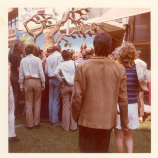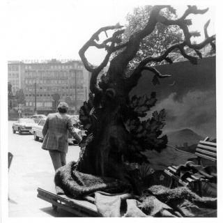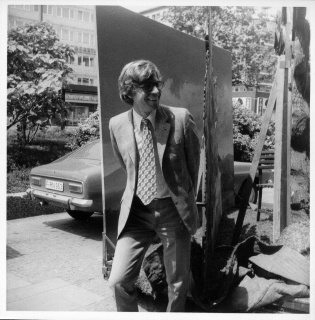 Er hinterläßt die ausgelegten Rasenstücke unter den Füßen und Hintern des umstehenden und sitzenden Publikums und entfernt sich kraftvoll und gelöst, seinen Landschaftswagen hinter sich herziehend, zu einer ihn bereits freudig erwartenden Zuhörerschaft.