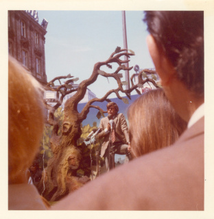 Er mustert das Publikum auf Waffentragende hin; dabei reißt er mehrfach die Arme in die Höhe, sie spreizend, um jedesmal eine Schautafel zu entrollen, auf der deutlich Menschen zu sehen sind, die in irgendeiner alltäglichen und profanen Verrichtung (wie Trompeteblasen) vom Tod getroffen werden. (Anschauungsmaterial von Pompeji bis Hiroschima steht ja reichlich zur Verfügung.)
