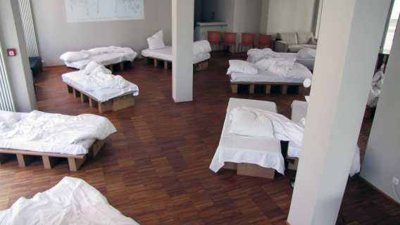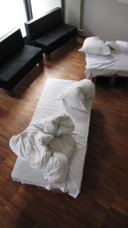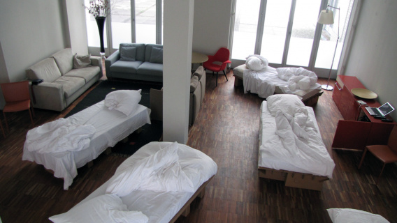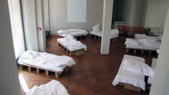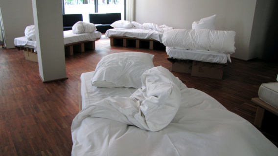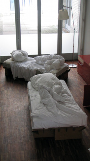 Die "12 Grundformen des verlassenen Bettes" von Simon Waßermann sowie die Skulptur eines "Schlafenden" von Silke Rehberg bilden vom12. bis zum 30. Mai 2012 die Mise-en-scène für die literarischen und philosophischen Erkundungen in der Denkerei.