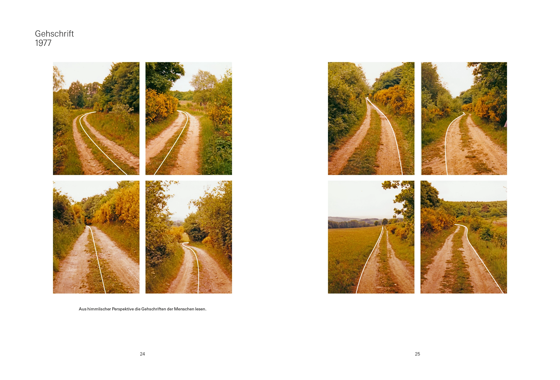 Wege stellten nur Spuren von Tätigkeitsgewohnheiten dar. Diese Spuren galt es zu lesen und sich auf neue Spuren zu verpflichten. Ich erinnere mich, damals durch immer wiederholtes Begehen in einem Unterholzgelände Spuren gelegt zu haben, die allesamt die Begrenzungslinien geometrischer Figuren darstellten und stets zu ihrem Ausgangspunkt zurückkehrten. Das erste Gefühl der Befriedigung aus einer kulturellen Leistung genoß ich in dem Augenblicke, in dem ich am Ausgangspunkt einer Spurlegung wieder ankam. Später wiederholte sich dieser Genuß stets dann, wenn es gelang, in einem fremden Gelände eine vorher festgelegte Gestalt durch das Begehen über die Landschaft zu schreiben.