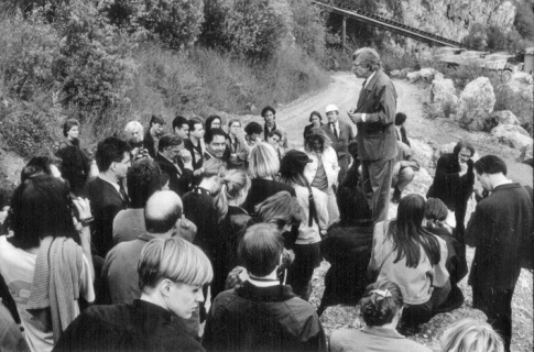 „Gemeinsam mit einigen Kollegen aus dem wissenschaftlichen Bereich, darunter Dietmar Kamper, Beat Wyss und Friedrich Kittler, bearbeitete ich 1991 in dem action teaching „Wir geben das Leben dem Kosmos zurück“ das Vorstellungsfeld einer Theorie der irdischen Lebensentstehung. In einer Wuppertaler Kiesgrube, in der auch der Neandertaler gefunden wurde, trafen zahllose Studenten ein, und gemeinsam schleuderten wir das Leben zurück ins All. Auf dem Film zu der Aktion sieht man deutlich das Streben der Künstler dokumentiert, sich erinnerbar werden zu lassen mit ihrem Werk. Die beschleunigten Prozesse sind zu sehen, wie auch berühmte Denkbewegungen versinnbildlicht sind. Denn mit dem Wurf des mit Lebensspuren imprägnierten Stein, ist nicht nur ein Bezug zur so genannten Lebensspurtheorie hergestellt, nach der aus dem Weltraum kleine Meteoriten bei uns einschlugen, die imprägniert waren mit Lebensspuren, sondern zugleich bezieht man sich auf Adorno, der bereits über die Fallkurve eines geworfenen Steines Denkbewegungen auslöste.“