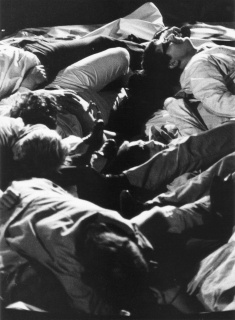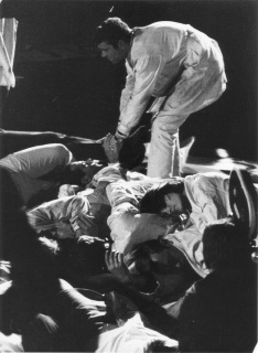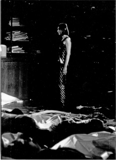 Verwandlung des Lebens in Reste, Unverwertbares, Spuren des Gewesenen. Immer erneuertes Angebot von Waren als Material, das durch seinen Verschleiß gebändigt werden muß. Jetzt beteiligen sich auch Zuschauer an der Umsetzung des Warenangebots. Deutliche Analogien zu anderen schon geschichtlichen Vernichtungsaktionen. Die Protagonistin läßt sich vom Professor überreden mitzumachen, um sich von dem Emotionsstau ihres gegenwärtigen stagnierten Lebens zu entlasten. Das gelingt ihr offensichtlich nicht. Deshalb versucht sie, sich vor dem übermächtigen Kaufhauswarenangebot auf Erinnerungswerte zurückzuziehen, die an alten Fotos, Kleidungsstücken, Landschaften, Fahrkarten usw. hängen. Diese Gegenstände sind im Spielfeld aufgebaut. Die Protagonistin spielt eine Geschichte, aus deren Zusammenhang möglicherweise die einzelnen verbrauchten Gegenstände (Erinnerungen) stammen. Sie will die vereinzelten Gegenstände mit ihrem Leben identifizieren, um dessen sinnfälligen Verlauf und Zusammenhang zu demonstrieren. Sie spielt und stellt einzelne Stationen dieses Lebens nach, kann ihnen aber in den Augen des Publikums keinerlei Evidenz abgewinnen. Sie wird ständig von den Umstehenden zur Korrektur gezwungen bzw. ausgelacht. Sie selbst wird den Zuschauern zum Objekt wie eine Ware, die man zerlegt an der gegenüberliegenden Wand in einzelnen 'Schaufenstern' nacheinander ausstellt: eine vereinzelte Hand, eine Kniekehle usw. Ihr Leben wird wie eine Ware beliebig vervielfältigbar: die Zuschauer kaufen Teile ihres Lebens und spielen mit ihr nach ihren Wünschen und Vorstellungen die einzelnen erinnerten Begebenheiten durch. Die angenehmsten Lebensabschnitte (nächtliche Autofahrt zu zweit, mit vollem Scheinwerferlicht durch das dunkle Spielfeld, wobei die Lichtkegel immer wieder im Spielfeld einzelne Begebenheiten erfassen, die sich nächtens an und auf Straßen abspielen) werden von mehreren Zuschauern gekauft und deshalb mehrmals mit immer anderen Zuschauern wiederholt. Die Lebensverbraucher bauen nach dem Muster der Lebensabschnitte der Protagonistin nun mit Frauen, Freunden oder Zufallsbekanntschaften ihr schon gelebtes Leben noch einmal, jedoch mit anderen Resultaten nach.