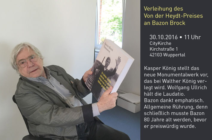 Kasper König stellt das neue Monumentalwerk THEOREME vor, das bei Walther König verlegt wird. Wolfgang Ullrich hält die Laudatio. Bazon Brock dankt emphatisch. Allgemeine Rührung, denn schließlich musste Bazon 80 Jahre alt werden, bevor er preiswürdig wurde.